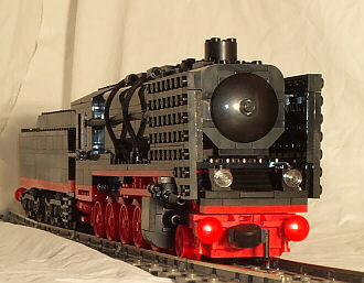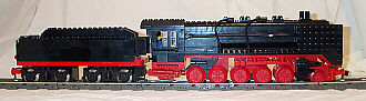 Das Modell:Dieses Modell ist Baujahr 11/99. Durch Glück waren mir bei einem Gebrauchtkauf 2 originalverpackte 7750-Rädersets in die Hände gefallen. Diese Räder haben einfach die ideale Größe für Güterzuglokomotiven deutscher Bauart. Die Lok ist voll kurven- und weichentauglich. Man sollte allerdings nicht versuchen mit voller Geschwindigkeit durch Weichenstrassen zu fahren, denn wegen des hohen Schwerpunktes kann die Lok kippen. Damit die Lok auch etwas wegziehen kann, habe ich den Tender mit 2 Motoren ausgestattet. Hier würden sich natürlich rote Motoren besser machen! Leider ist der Tender etwas zu lang geraten, aber weiter kann man die beiden Motoren nicht zueinander bauen. Ansonsten halte ich die Proportionen und Details für