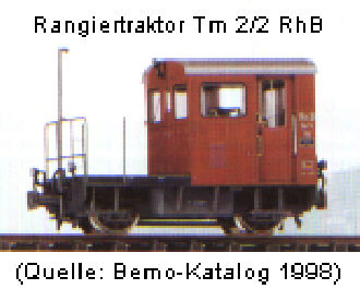 Das Vorbild:Rangiertraktoren werden bei den schweizerischen Schmalspurbahnen für den Verschub der Güterwaggons in den kleineren Bahnhöfen eingesetzt. Sie sind entweder per Verbrennungsmotor oder aber per Elektromotor angetrieben. Die Tm 2/2 dienen auch als Plattform für spezielle Bahndienstfahrzeuge, z.B. für Turmfahrzeuge zur Wartung der Oberleitung.