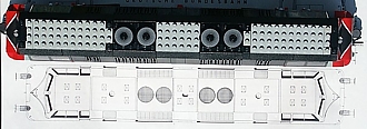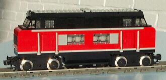 | Nochmals eine seitliche Aufnahme, die die Proportionen gut wiederspiegelt. | Besonders schwierig umzusetzen waren die schwarze Schrägen Lüftergitter und die Einstiegstüren, die in SNOT-Technik erstellt wurden. Etwas minderbemittelt wirkt leider auch hier wieder der viel zu kurze Achsabstand der LEGO® 9V Eisenbahnmotoren.