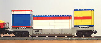 | Natürlich können die neuen Container auch auf den vorhandenen Waggons transportiert werden. Ein paar geringe Anpassungen an den Halterungen für die Container auf dem Waggon waren allerdings notwendig, damit das Ergebnis wie nebenstehend aussieht.