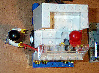 | Der Trick, wie man Fahrer und Beifahrer in das Führerhaus setzen kann ist eigentlich ganz simpel. Anstelle von Sitzen werden 2-Knopfplättchen mit einem mittleren Knopf eingebaut. Somit verschiebt sich die Sitzposition der Minifigs um jeweils einen halben Stein zur Mittelachse des Fahrzeugs hin.